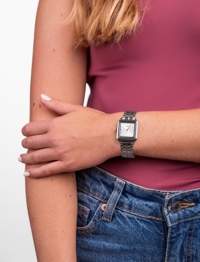 ROEEN zachwyca czystym designem, metalową bransoletą i kwadratową tarczą, którą zdobią delikatne kryształy zamiast cyfr. Elegancki wygląd uzupełniają precyzyjne detale,…