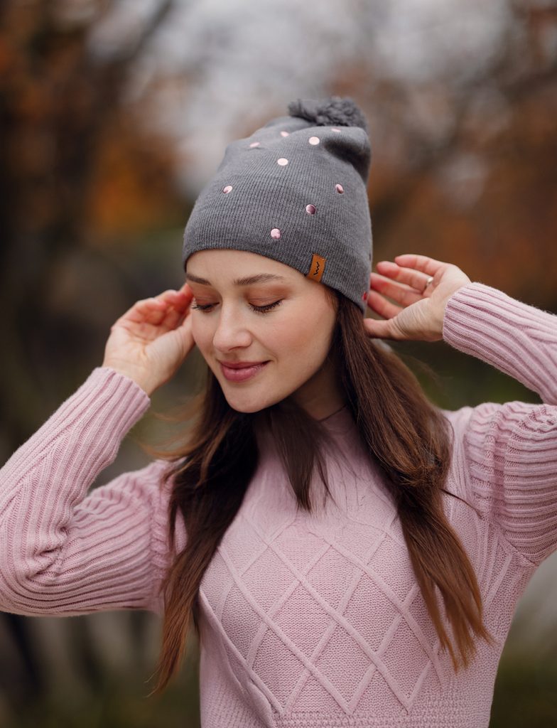 Więcej informacji„Czapki z pomponem przełamują stylizacje, nadając im luźnego charakteru. Szara czapka w kropki je wesoła i urocza, wbrew pozorom doskonale wygląda nawet z eleganckim okryciem wierzchnim.“