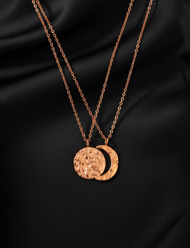 Parowy naszyjnik Lunara z motywami księżyca, który łączy dwa elementy w delikatnym dialogu światła i cienia. Minimalistyczny design podkreśla eleganckie krzywe faz…