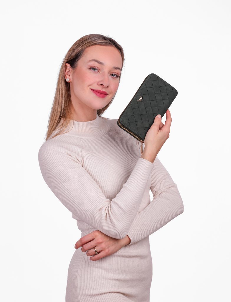 Nightie Nicci Intrecciato Green duży portfel na suwak z plecionym wzorem