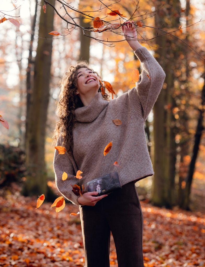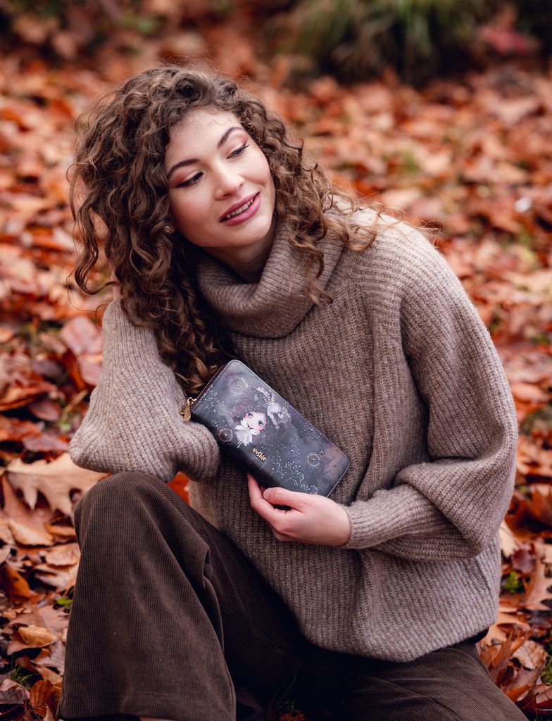 Dwie przestronne przegródki pomieszczą banknoty bez konieczności ich składania i nie zabraknie miejsca na karty oraz małe skarby, które nosisz ze sobą każdego dnia. Lekki, elegancki i pełen delikatnej energii.