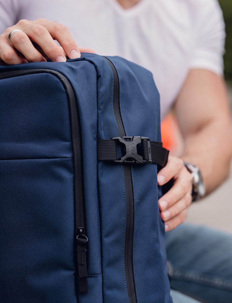 - Pętla z tyłu plecaka do mocowania na walizce